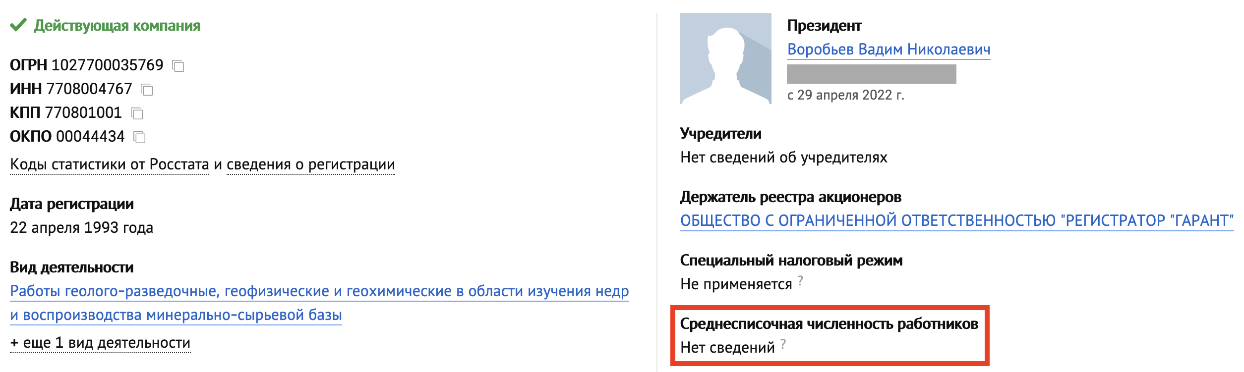 С одной стороны, высокая среднесписочная численность работников (от 250 человек) является признаком широкого масштаба деятельности компании, но с другой, как мы видим, у крупных известных компаний этот показатель может быть вообще не указан.
