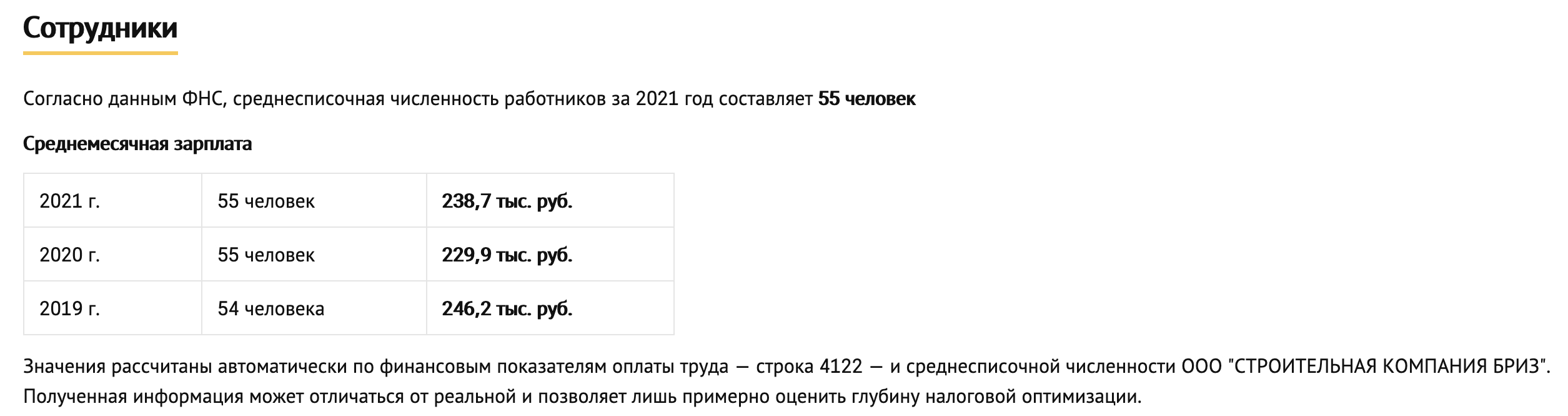 Рис. 14. Сведения о среднесписочной численности и среднемесячной зарплате работников ООО «Строительная компания Бриз» в сервисе проверки контрагентов «Чекко»