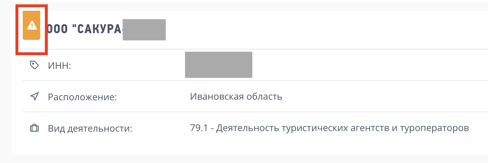 Кликнув на адрес, вы перейдете в результаты поиска – тут нужно найти интересующую компанию. Размещенный рядом с наименованием организации восклицательный знак на оранжевом фоне (рис. 8) будет говорить о том, что сведения об адресе признаны недостоверными, а значит организацию может ждать исключение из ЕГРЮЛ.