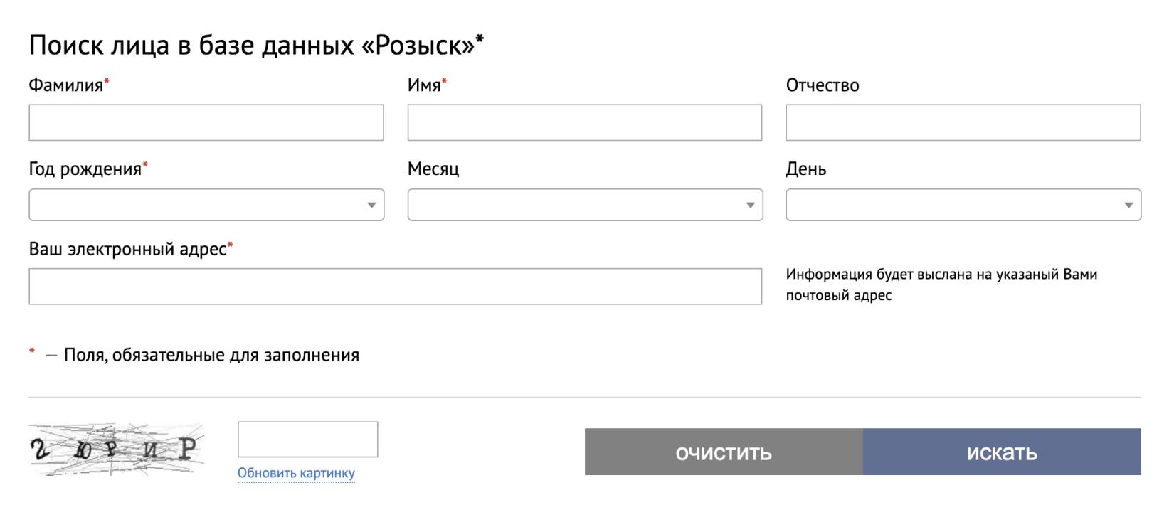 База содержит информацию только о тех лицах, в отношении которых розыск ведется в установленном порядке с использованием СМИ. Результат моментально придет на электронную почту (рис. 2).