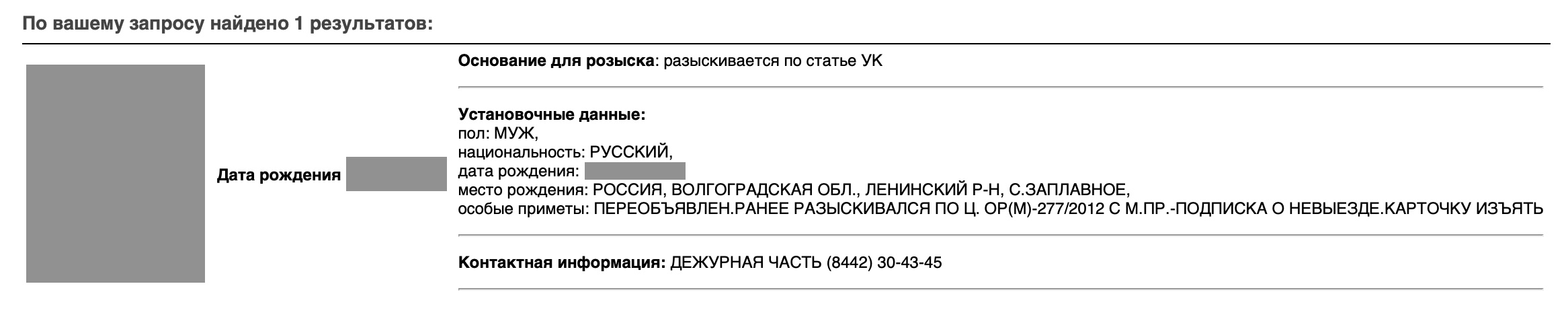 Рис. 2. Результат поиска в сервисе «Внимание, розыск!»
