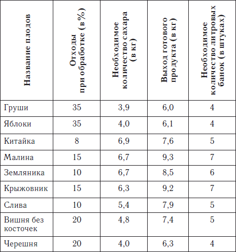 В хорошем варенье сиропа и плодов одинаковое количество. Если сиропа слишком много, варенье будет недоваренным, так как плоды не успеют пропитаться и сморщатся. Если же сиропа мало, варенье получится переваренным. Для того чтобы определить нужное количество сахара, используйте табл. 2.