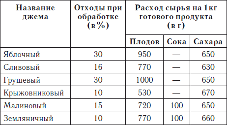 На 1 кг плодов в среднем требуется 1 кг сахара. Если они кислые, на каждый килограмм потребуется 1,2 кг сахара. Расход сырья представлен в табл. 3.