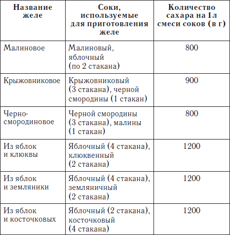 Если кислот и пектиновых веществ в плодах недостаточно, смешивают несколько разных соков и добавляют лимонную кислоту из расчета 5 г на 1 л сока. Для приготовления желе из смесей соков используйте табл. 4.