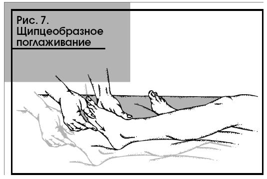 Щипцеобразное поглаживание – вспомогательный прием, который выполняется щипцеобразно сложенными пальцами, чаще большим, указательным и средним или только большим и указательным (рис. 7). Прием применяется при массаже пальцев кисти, стопы, сухожилий, небольших мышечных групп, лица, ушных раковин, носа.