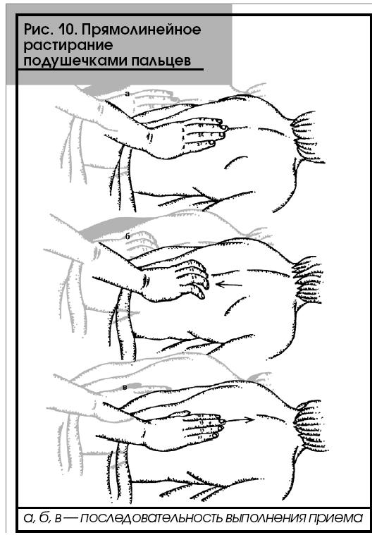 Прямолинейное растирание – вспомогательный прием, который выполняется концевыми фалангами одного или нескольких пальцев (рис. 10). Применяется данный прием при массаже небольших мышечных групп в области суставов, кисти, стопы, важнейших нервных стволов, лица.
