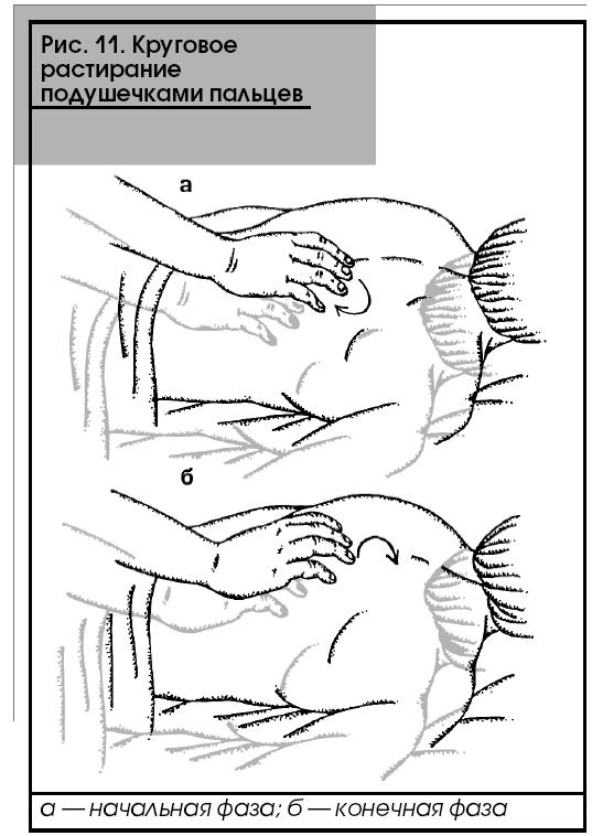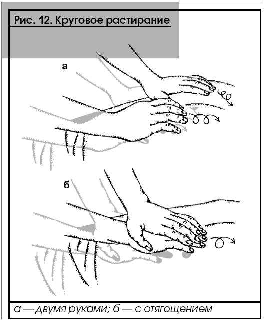 Круговое растирание – вспомогательный прием, который выполняется с круговым смещением кожи концевыми фалангами с опорой на большой палец или на основание ладони (рис. 11).