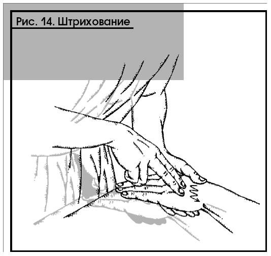 Штрихование – вспомогательный прием, который производится подушечками концевых фаланг указательного и среднего пальцев или всеми пальцами, кроме большого (рис. 14). Пальцы при этом выпрямлены, максимально разогнуты и находятся год углом 30° к массируемой поверхности. Надавливают короткими поступательными движениями, смещая массируемые ткани, передвигаясь в заданном направлении как продольно, так и поперечно. Применяют в области рубцов кожи, при атрофии отдельных мышечных групп, заболеваниях кожи (псориаз, экзема).