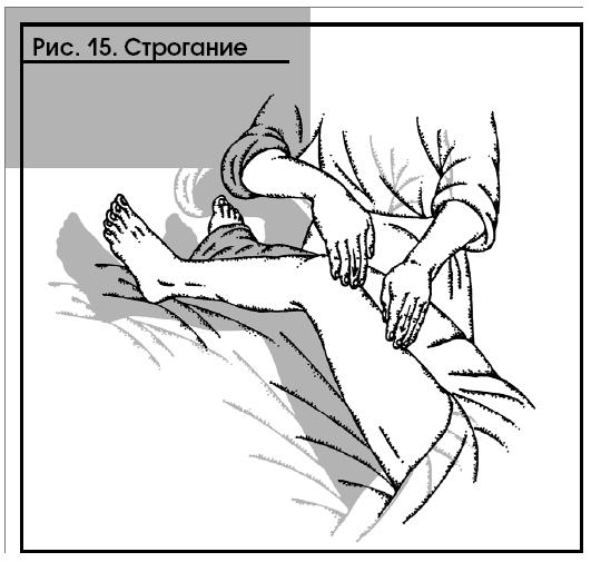 Строгание – вспомогательный прием, который выполняется одной или двумя руками (рис. 15). Кисти массажиста устанавливаются друг за другом, и при их поступательных движениях, напоминающих строгание, подушечки пальцев погружаются в ткани, производя их растяжение, смещение.
