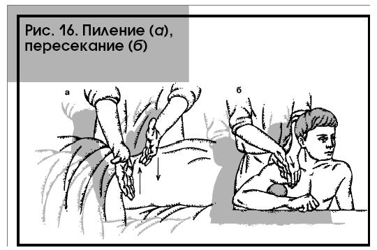 Пиление – вспомогательный прием, который производят локтевым краем кисти или обеих кистей (рис. 16, а). При пилении двумя руками кисти массажиста установлены так, чтобы ладонные поверхности были обращены друг к другу и находились на расстоянии 1–3 см. Пилящие движения производят в противоположных направлениях. При этом между кистями должен образоваться валик из массируемой ткани. Если при выполнении данного приема участвуют лучевые края кисти, то он называется пересеканием (рис. 16, б). Оба приема применяются при массировании крупных суставов, спины, живота, бедер, шейного отдела.