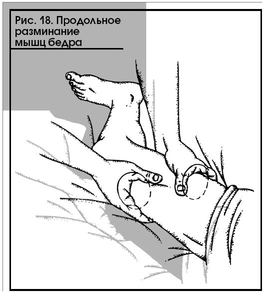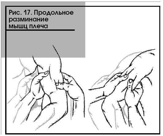 Продольное разминание применяется при массаже конечностей, в области таза, спины, боковых поверхностей шеи (рис. 17, 18).