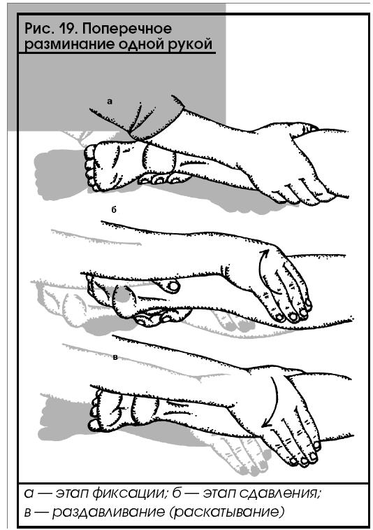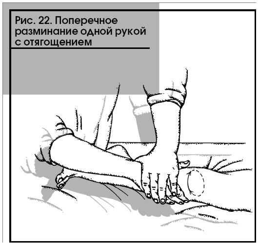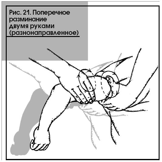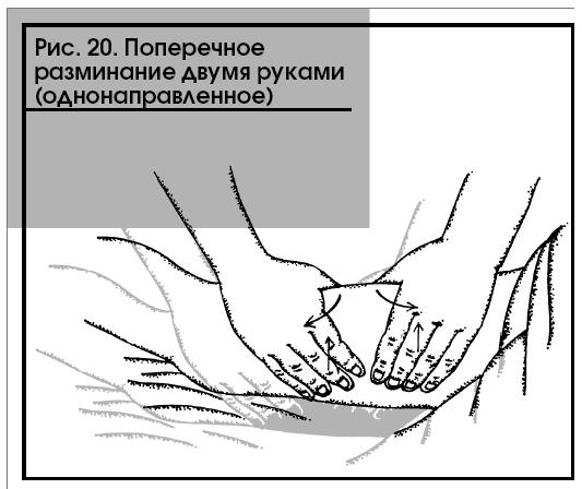 Прием «поперечное разминание» применяют при массаже спины, областей таза, шейного отдела, конечностей и др. (рис. 19–22).