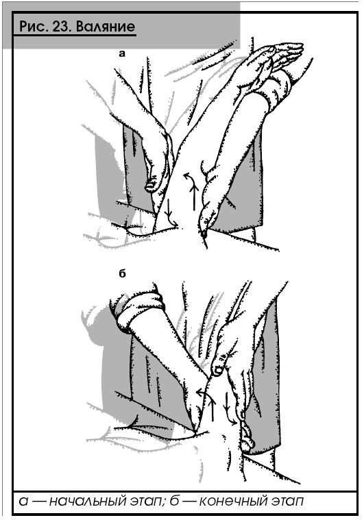 Валяние – вспомогательный прием, который выполняется чаще при массаже конечностей (рис. 23). Руки массажиста ладонями обхватывают с обеих сторон массируемый участок, пальцы выпрямлены, кисти параллельны, движения производятся в противоположных направлениях массируемой области. Применяется при массаже бедра, голени, предплечья, плеча.