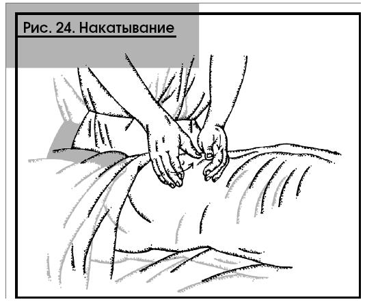 Накатывание – вспомогательный прием, при котором массируемый участок захватывают или фиксируют одной кистью, а другой производят накатывающие движения, перемещая расположенные рядом ткани на фиксирующую кисть, и так передвигаются по массируемой области (рис. 24). Накатывающее движение можно производить на отдельные пальцы, кулак. Прием применяется при массаже живота, груди, боковых поверхностей спины.