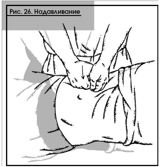Надавливание – прием, выполняемый пальцем или кулаком, основанием ладони, можно с отягощением (рис. 26). Применяется в области спины, вдоль паравертебральной линии, в области ягодиц, в местах окончаний отдельных нервных стволов (в зоне расположения биологически активных точек).