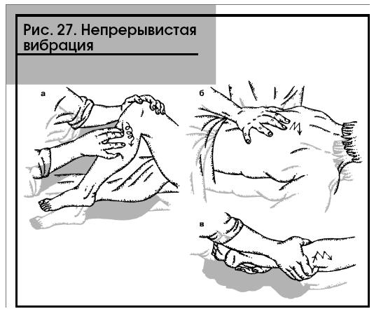 Непрерывистая вибрация – вспомогательный прием, который выполняется концевой фалангой одного или нескольких пальцев в зависимости от области воздействия (рис. 27, о), при необходимости – одной или обеими кистями (рис. 27, б), всей ладонью (рис. 27, в), основанием ладони, кулаком (пальцами, сжатыми в кулак). Этот прием применяют в области гортани, спины, таза, при массаже мышц бедра, голени, плеча, предплечья, по ходу важнейших нервных стволов, в месте выхода нерва.