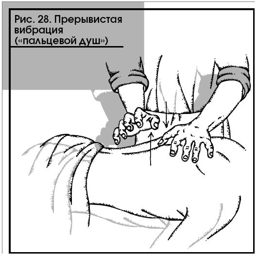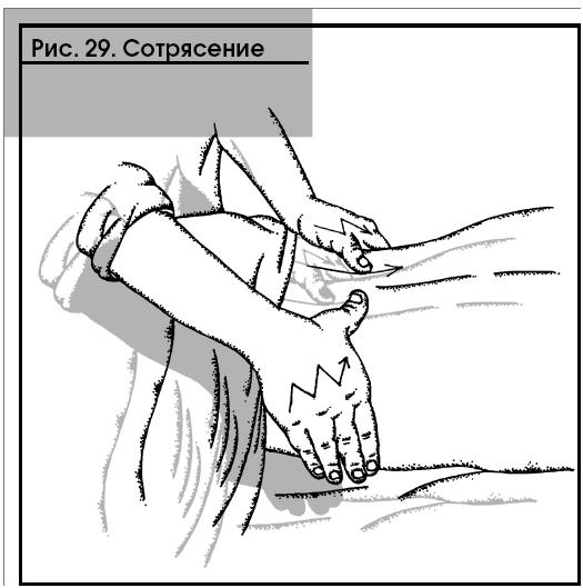 Сотрясение – вспомогательный прием, который выполняется отдельными пальцами или кистями (рис. 29). Движения производятся в различных направлениях и напоминают просеивание муки через сито. Прием применяют в области спастических мышечных групп, гортани, живота, отдельных мышц.