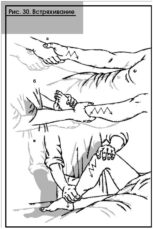 Встряхивание – вспомогательный прием, который выполняется обеими кистями или одной с фиксацией кисти (рис. 30, а, б) или голеностопного сустава (рис. 30, в) массируемого. Этот прием используют только при массаже конечностей. При массаже рук производят «рукопожатие» и встряхивание в горизонтальной плоскости. При массаже ног встряхивание выполняется в вертикальной плоскости с фиксацией голеностопного сустава при выпрямленном коленном суставе.