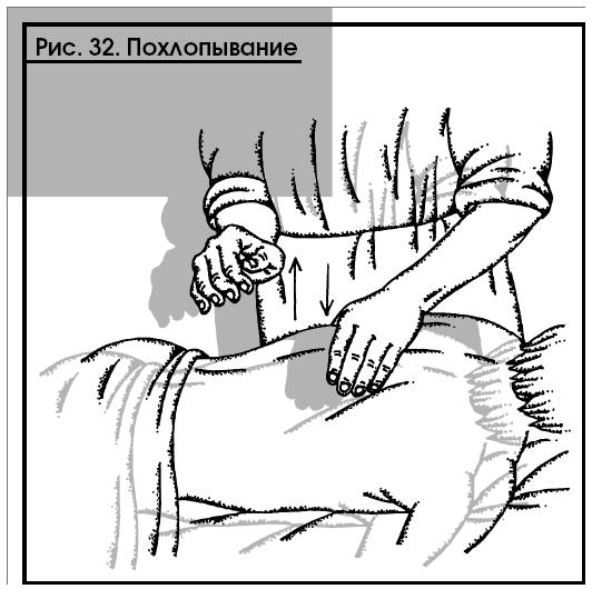 Похлопывание – вспомогательный прием, который проводится ладонной поверхностью одной или обеих кистей, пальцы при этом сомкнуты или согнуты, образуя воздушную подушку для смягчения удара по телу массируемого (рис. 32). Прием применяют в области груди, спины, поясницы, таза, верхних и нижних конечностях.