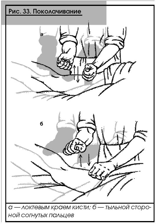 Поколачивание – вспомогательный прием, который выполняется локтевыми краями одной или обеих кистей, сжатых в кулак, а также тыльной стороной кисти (рис. 33). Прием применяют при массаже спины, поясничной, ягодичной областей, нижних и верхних конечностей.