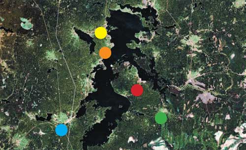 Вот спутниковый снимок нашего района. Цветными кружочками помечены деревни, упомянутые в рассказе: красным – Булавино, синим – Росинушка, желтым – Задольское, зеленым – Криново, оранжевым – Подорожье. На снимке видно, что кругом озера и сплошные леса темно-зеленого цвета. А небольшие светлые пятна около деревень – это видимые со спутника остатки полей и покосов. Когда-то, еще до войны, почти все окрестное пространство занимали посевные поля. По рассказам старожилов, из Булавино было видно Криново, а через поля – другой берег озера. Криново расположено в низине, а Булавино – на горке. Это считалось очень крутым – жить в деревне, стоящей на горке. Булавинские девушки по этой причине якобы отказывались выходить замуж за криновских парней: мол, не хочу жить в яме. Теперь, конечно, Криново не видно – одни леса. Редкий случай почти полной победы природы над человеком.