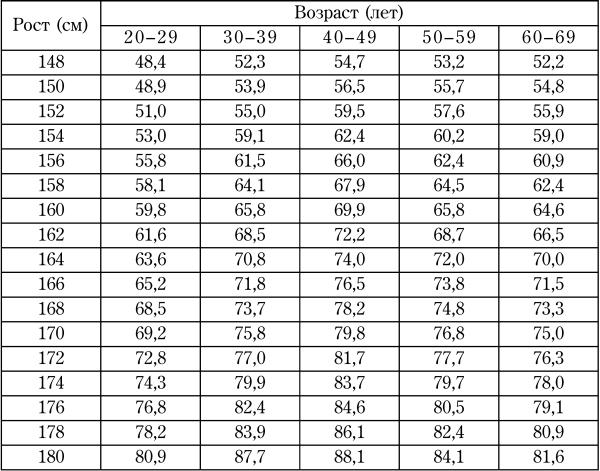 Таблица 1. Предельно допустимый нормальный вес тела (кг) женщин в зависимости от роста и возраста