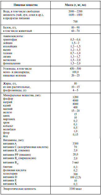 Лактация – выделение грудного молока из молочной железы – энерго– и материалоемкий процесс. Женщина должна увеличить пищевую ценность пищи на 700 ккал. Энергетическая ценность рациона должна составлять 3000 ккал, пища должна содержать 88 г белка, 88 г жира, углеводов 450–500 г. В период грудного вскармливания женщине необходимо полноценное питание, чтобы сохранить полноценный состав грудного молока, обеспечить пищевые потребности ребенка, сохранить свое здоровье. Полноценное питание может быть при ежедневном употреблении в пищу 150–200 г мяса, 100–150 г творога, 20–30 г сыра, 50 г масла, в том числе 15–20 г сливочного и 25–30 г растительного, 1 яйца, 0,5 л молочных продуктов, 600 г овощей, 200 г фруктов, не более 500 г хлеба. Потребление жидкости увеличивается до 2 л. Жидкость должна быть по потребности, искусственное завышение объема жидкости не приводит к усилению лактации. Нормальный диурез свидетельствует о достаточном количестве жидкости в диете. Желательно, чтобы перед каждым кормлением женщина могла выпить стакан кефира, компота или чая с молоком.