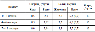 * Нормы потребления белка для детей 4–6 месяцев и особенно 7-12 месяцев увеличены по сравнению с международными, поэтому стремиться перекрывать их не следует. Потребности даны в расчете на 1 кг массы тела.