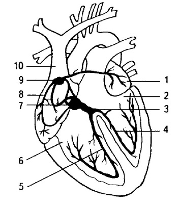 1 – левое предсердие, 2 – левый желудочек, 3 – пучок Гиса, 4 – левая ножка пучка Гиса, 5 – правая ножка пучка Гиса, 6 – правый желудочек, 7 – атриовентрикулярный узел, 8 – правое предсердие, 9 – синусовый узел, 10 – верхняя полая вена