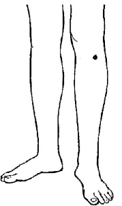 5. Локализация точки: на голени, в углублении, расположенном на 4 поперечных пальца ниже нижнего края надколенника (при вытянутой ноге) и на ширину пальца наружу от бугристости большеберцовой кости.