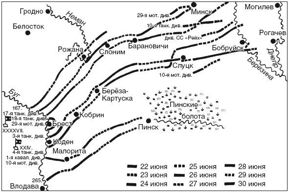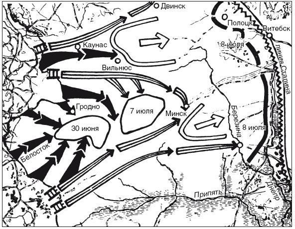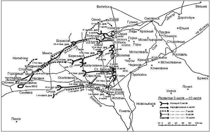 Танковые группы уверенно продолжили свой путь на восток, когда еще звучали последние выстрелы между Белостоком и Минском. 3-я танковая группа получила приказ отправиться из Минска на северо-восток, чтобы установить связь с правым флангом группы армий «Север» на Дюне (Западная Двина). А в то же самое время 2-я танковая группа должна была отправиться к Днепру.