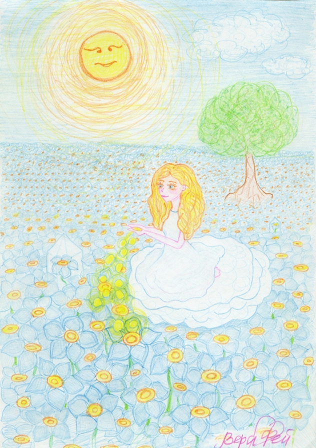 Над волшебным полем незабудок взошла луна. Вокруг цветов кружились светлячки, похожие на маленькие звёзды. В его центре стоял дуб. Луна взглянула на пушистую листву огромного дерева, в которой спала белокурая девушка. Открыв глаза, она поднялась и посмотрела по сторонам.