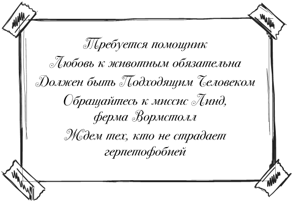 * * *Над дверью Магазина Сладостей висела табличка «Лавка Филлинг & Дентчер: здесь вы получите все, что захотите». Поскольку у них есть высокие стеклянные банки со всеми сладостями, какие только можно вообразить, и они взвешивают их в маленьких бумажных пакетах, все называют эту лавочку просто Магазином Сладостей. Я пришел туда по заданию Фрэнк, чтобы купить чипсы с сыром и луком, когда заметил на окне объявление. Оно было написано зелеными чернилами замысловатым почерком с завитушками и зажато между рекламой подержанного тостера («Почти работает, выгодная покупка») и размытой фотографией жирного полосатого кота с белыми лапами («Вы видели Снаффи? Вознаграждение сто фунтов»):