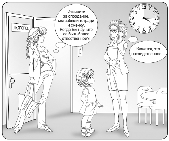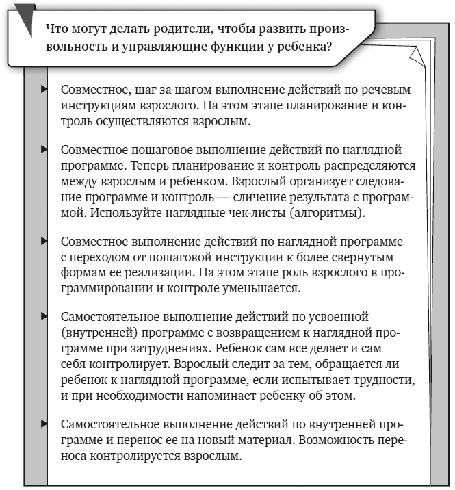 Важны действия родителей, их самоорганизация, потому что ребенок учится в своей семейной системе, глядя на самых близких. Если родители заранее, с вечера, помогают собирать (пока ребенок маленький) вещи, готовят сменную обувь, проговаривают, что планируется завтра, без опозданий, полностью укомплектованным приводят ребенка на занятия, постепенно передавая ответственность по этим делам ребенку, то планирование, самоорганизация и самоконтроль успешно формируются. Если на занятия ребенок регулярно опаздывает, а сменка периодически забывается, то ожидать ответственного поведения не стоит (рис. 7). Остается лишь надеяться на педагогов, которые станут значимыми взрослыми и на своих занятиях будут формировать произвольность, регуляцию и контроль.
