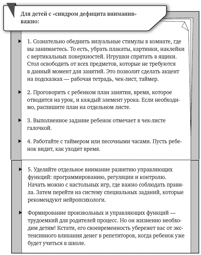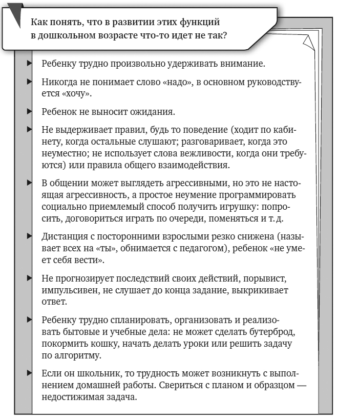 Функции программирования, регуляции, планирования и самоконтроля можно называть управляющими. Произвольные функции – умение действовать по заданной инструкции или придерживаться собственного плана, не отвлекаясь на сиюминутные порывы. Состояние, когда эти функции не развиты, часто связывают с дефицитом внимания.