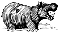 Бегемота (Hippopotamus amphibius) еще называют гиппопотамом. Живет он в Африке. У бегемота огромное туловище на коротких толстых ногах. Ноги оканчиваются четырьмя пальцами, одетыми своеобразными копытцами и соединенными небольшой перепонкой. Голова почти без шеи, большая, тяжелая, причем ноздри, глаза и маленькие ушные раковины несколько приподняты и расположены так, что бегемот может и дышать, и смотреть, и слышать, оставаясь под водой. На коже бегемота нет шерсти, только на морде и на хвосте имеются отдельные жесткие волосы. Кожа очень толстая, даже крокодилу или льву трудно ее прокусить.