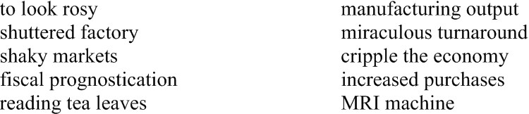 Phrases: employed in all sectors of the economy, the backbone/mainstay of the economy, growth in/of the economy, the president’s handling of the economy, the size of the economy, the state of the economy.
