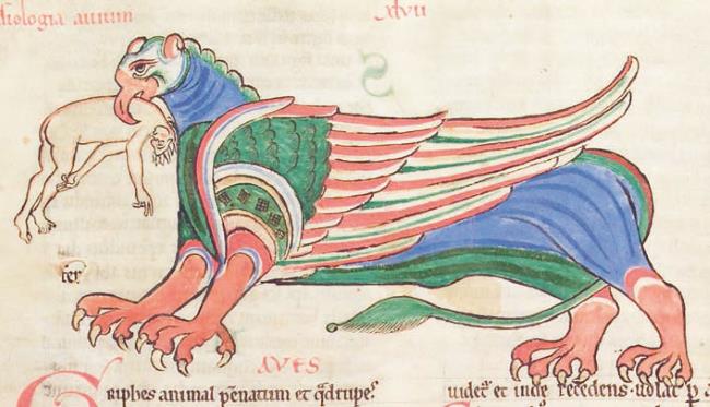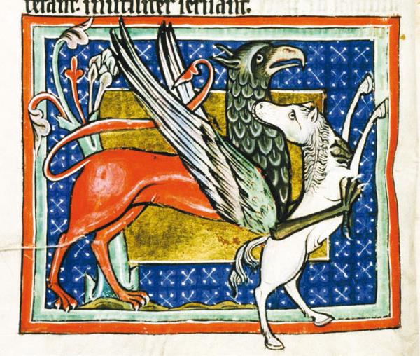 Среди средневековых гибридов большой популярностью пользовался грифон, в чьем облике соединились черты льва (туловище) и орла (крылья, передние лапы и голова). Изображения грифонов известны еще в древневосточных культурах, они часто встречаются в древнегреческой вазописи и в древнеримских памятниках, где нередко сопровождают языческих божеств, заменяя им лошадей. Античные авторы описывали грифонов как обитателей далеких земель: севера Европы, легендарной северной страны Гипербореи, а также территорий Индии и Эфиопии. Главным делом грифонов было охранять и защищать месторождения золота от посягательств одноглазых людей аримаспов. Представление о том, что дальние земли населены этими странными существами, было унаследовано и Средневековьем. В знаменитой книге путешествий XIV века «Приключения сэра Джона Мандевиля» (фр. «Livre des merveilles du monde») говорится о том, что грифонов особенно много в Азии. В тексте подчеркиваются колоссальный размер и сила этих существ: говорится, что один грифон сильнее, чем восемь львов или сто обычных орлов. Он даже способен похитить и унести в свое гнездо большого коня. Исидор Севильский поместил грифонов в раздел о диких животных, описав их следующим образом: «четвероногие животные, покрытые перьями. Этот род зверей обитает в Гиперборейских горах. Всеми частями тела они – львы; крыльями и лицом похожи на орлов; чрезвычайно враждебны по отношению к лошадям. Увидев человека, разрывают его на части». На миниатюрах средневековых бестиариев зачастую можно встретить сцены нападений грифона на человека или лошадь, которые свидетельствовали об их враждебности и опасности.