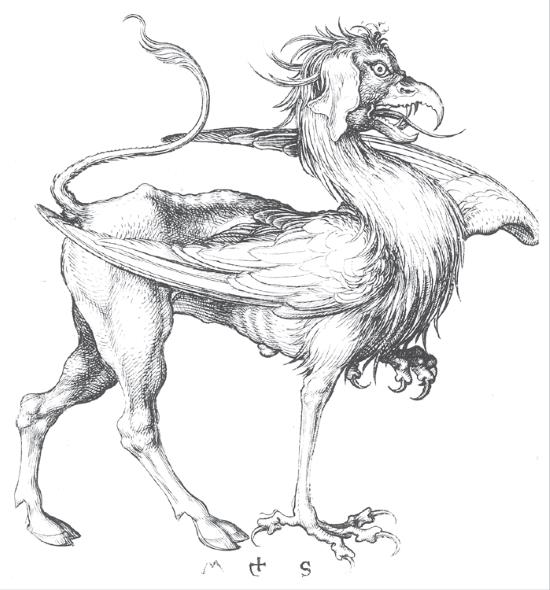 Изображения грифонов можно встретить и на христианских надгробиях, где они символизируют стражников мира мертвых, оберегающих покой погребенных. Природа грифона, соединяющая в себе земного и небесного зверя, ассоциировалась также с идеей двойственной природы Христа, одновременно обладающего и земной, и божественной сущностью. Образ грифона, как можно убедиться, чрезвычайно многозначен, его можно трактовать по-разному, в зависимости от контекста, в котором он находится. Однако позднесредневекового немецкого гравера Мартина Шонгауера символический смысл этого существа интересовал в меньшей степени, гораздо больше его привлекала необычная гибридная внешность грифона, позволяющая поэкспериментировать с сочетаниями фактур шерсти и перьев. Гравер трактовал фигуру грифона нестандартно, строго не привязываясь к средневековой традиции: он, например, с легкостью заменил львиные лапы на бычьи. Шонгауер натуралистично передал текстуру перьев грифона и его выразительный мускульный рельеф, подчеркивающий легендарную силу этого фантастического животного. Несмотря на гибридную природу, облик грифона не был лишен определенной доли благородства.