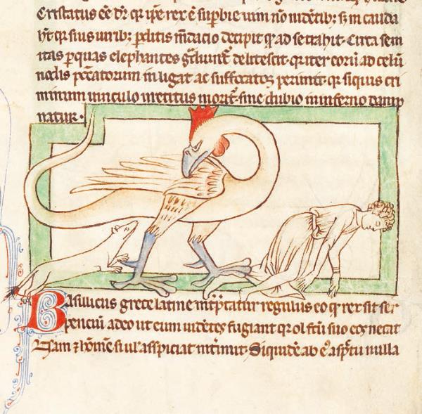 На миниатюрах средневековых бестиариев василиск нередко изображался не как змея, а как существо, напоминающее петуха со змеиным хвостом. Откуда возник такой гибридный образ? Ответить на этот вопрос помогает энциклопедия «О природе вещей» (лат. «De natura rerum»), составленная в XIII веке Фомой из Кантимпрэ. В ней приведены подробные сведения о василиске: «Петух, одряхлевший к старости, сносит яйцо, из которого вылупляется василиск. Однако для этого необходимо совпадение многих вещей. В обильный и горячий навоз он помещает яйцо, и там оно согревается, словно родителями. Спустя много времени появляется птенец и взрастает сам по себе, подобно утенку. У этого животного хвост змеи, а тело петуха. Те, кто утверждает, что видел появление подобного существа на свет, рассказывают, будто у этого яйца вовсе не скорлупа, а шкура крепкая и настолько прочная, что ее невозможно проколоть. Бытует такое мнение, что яйцо, которое сносит петух, вынашивает змея или жаба»[12]. Единственное животное, способное убить василиска, – ласка (лат. mustellae).