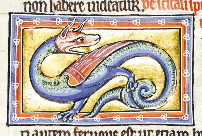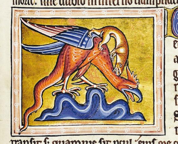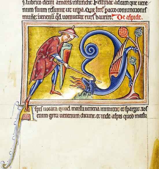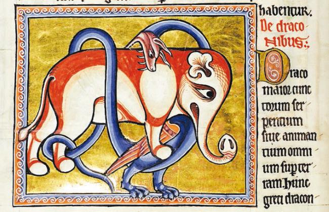 Дракон – один из самых древних образов в мировой культуре, встречающийся в мифах и фольклоре многих народов. В средневековом искусстве он чаще всего появляется в апокалиптическом контексте, выступая символическим воплощением самого дьявола. Однако дракона можно встретить и в бестиариях наряду с другими животными. Сведения о нем приводятся в разделе про змей и ящериц. Связано это с тем, что в древнегреческом языке слово «дракон» нередко относилось не только к фантастическому существу, но также могло обозначать и обычную змею. Исидор Севильский считал, что драконы обитают в пещерах Эфиопии и Индии. Он подчеркивал, что они больше всех животных на земле и умеют летать. Дракон не ядовит, но имеет очень сильный хвост, которым может наносить сокрушительные удары или сдавливать свою жертву. При этом Исидор ничего не упоминает о способности драконов выдыхать огонь, ограничиваясь лишь фразой о том, что своим дыханием они «возмущают» воздух.