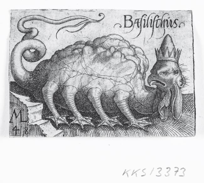 В христианской традиции василиск стал воплощением вселенского зла и самого дьявола. В библейских текстах этот монстр упоминается исключительно в негативном контексте: «Я пошлю на вас змеев, василисков, против которых нет заговариванья, и они будут уязвлять вас, говорит Господь» (Иер. 8:17). Удивительно, но несмотря на негативную символику, василиск был весьма популярен в средневековой геральдике. Этому поспособствовал и его царственный статус и слава непобедимого соперника. Изображение василиска присутствовало в средневековых гербовых щитах библейских героев Иисуса Навина и Иуды Маккавея, известных своими выдающимися военными подвигами. Василиск также является символической фигурой для города Базеля (Швейцария), в названии которого отражается связь с именем этого монстра: Basilisk («Василиск») – Basel («Базель»). На многих скульптурных изображениях, украшающих сегодня архитектурные постройки и фонтаны Базеля, можно встретить василиска, держащего щит с гербом города. Согласно одному из преданий, на месте города в древности находилась пещера, где жил василиск. По другой версии, когда-то в Базеле петух снес яйцо (из которого потенциально мог вылупиться василиск), за что он был казнен, а яйцо сожжено. На гравюре Мельхиора Лорка, созданной уже в середине XVI века, мы наблюдаем перерождение василиска: он теряет свои крылья, зато получает лапы с перепонками, а его туловище покрывается отвратительными буграми. Мастер Северного Возрождения не стремился досконально следовать средневековой изобразительной традиции, а позволил себе пофантазировать, чтобы максимально внятно выразить мерзкую сущность этого монстра.