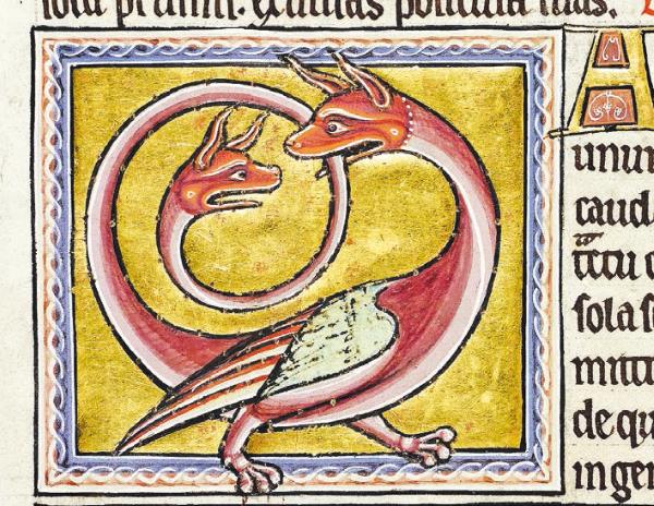Амфисбена. Миниатюра из Абердинского бестиария, начало XIII век, Англия (MS 24, библиотека Абердинского университета, Шотландия, f. 68v).