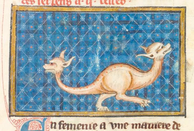 Амфисбена из «Книги сокровищ». Первая четверть XIV в., Франция (Yates Thompson MS 19, f. 51v, Британская библиотека).