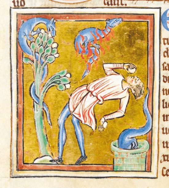 Аспид и змеелов. Миниатюра из Абердинского бестиария, начало XIII века, Англия (MS 24, библиотека Абердинского университета, Шотландия, f. 67v).