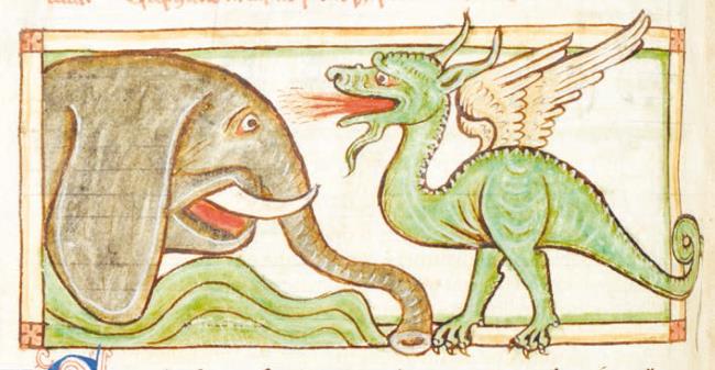 Слон, повстречавший дракона. Бестиарий середины XIII века, (Британская библиотека, Лондон, Harley MS 3244, f. 39v).