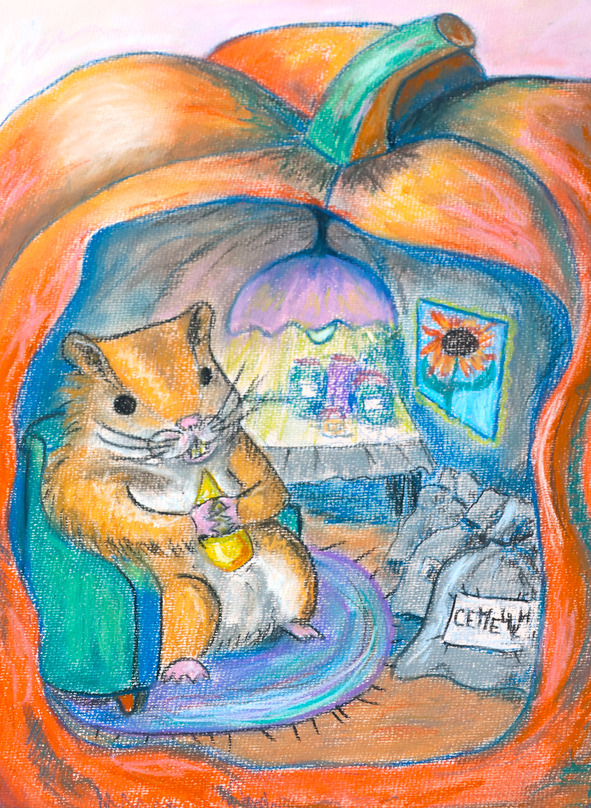 Дома они помыли керамическую тыкву с мылом, чтобы никакая случайная инфекция не повредила их питомцу. Потом поставили домик в клетку Афанасия. Хомяк обежал вокруг тыквы, обнюхал её, ощупал своими чувствительными усиками. Видимо, домик Афанасию понравился, потому что хомяк начал переносить туда свои запасы еды. Затем деловитый зверёк натаскал опилок, заткнул ими вход и, довольный, заснул.