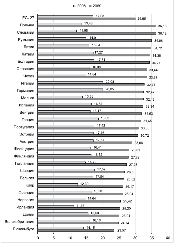 Рис. 1.2. Процентный состав лиц старше 65 лет в 2008 и 2060 годах в государствах Евросоюза согласно исследованиям Евростата [81]