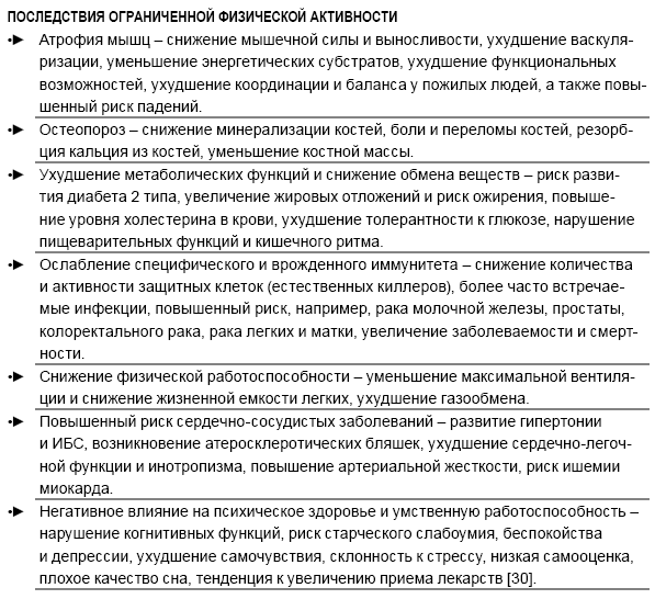 Ниже приводятся обобщенные выводы многочисленных исследований о воздействии ограниченной физической активности (гиподинамии, гипокинезии или мышечной гипотонии) на здоровье человека.