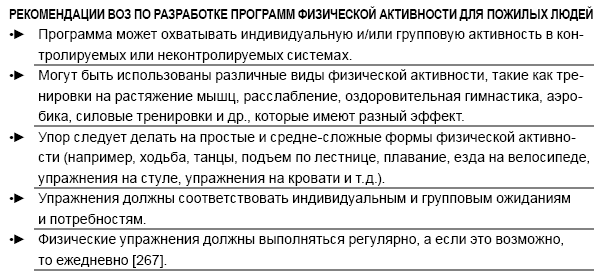 Всемирная организация здравоохранения в рекомендациях по поощрению физической активности пожилых людей указала, что «хотя физически активный образ жизни возможен без участия в официальной программе упражнений, однако во многих промышленно развитых обществах только организованные программы предоставляют возможность поддерживать физическую активность» [267]. При разработке программ физической активности для пожилых людей ВОЗ рекомендовала учитывать основные условия, которым такие программы должны соответствовать.